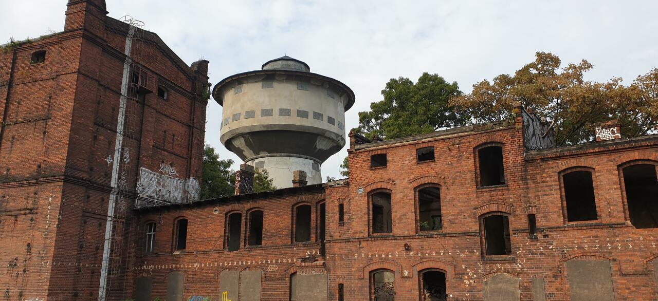 Wieża wodna przy ulicy Roboczej widziana poprzez dawny młyn.