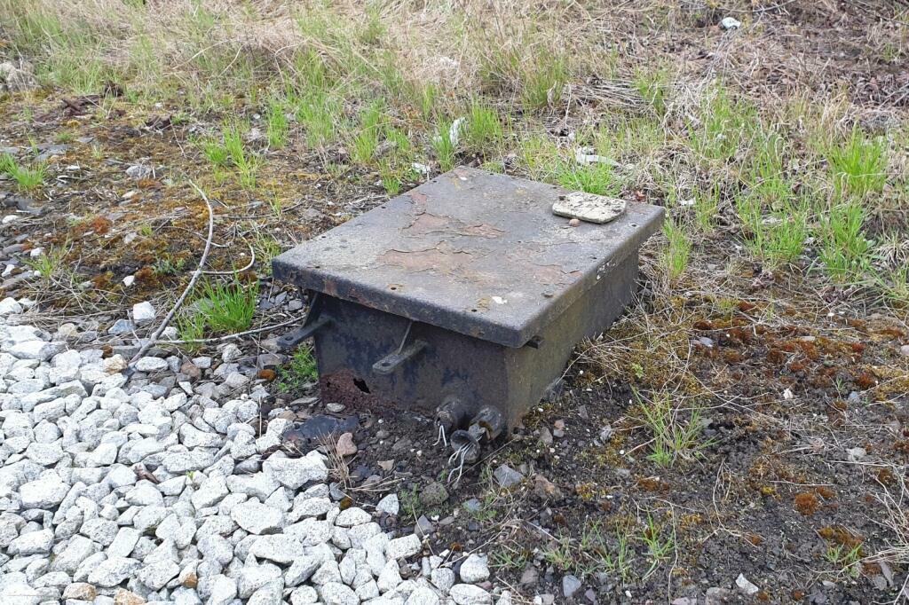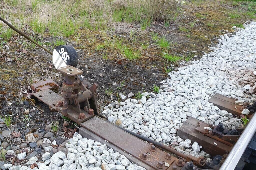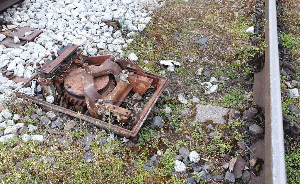 Nieużywany, częściowo zdemontowany elektryczny napęd zwrotnicowy VES. Niestety pozbawiony silnika. Po drugiej stronie torów znajduje się teren gdzie była lokomotywownia.