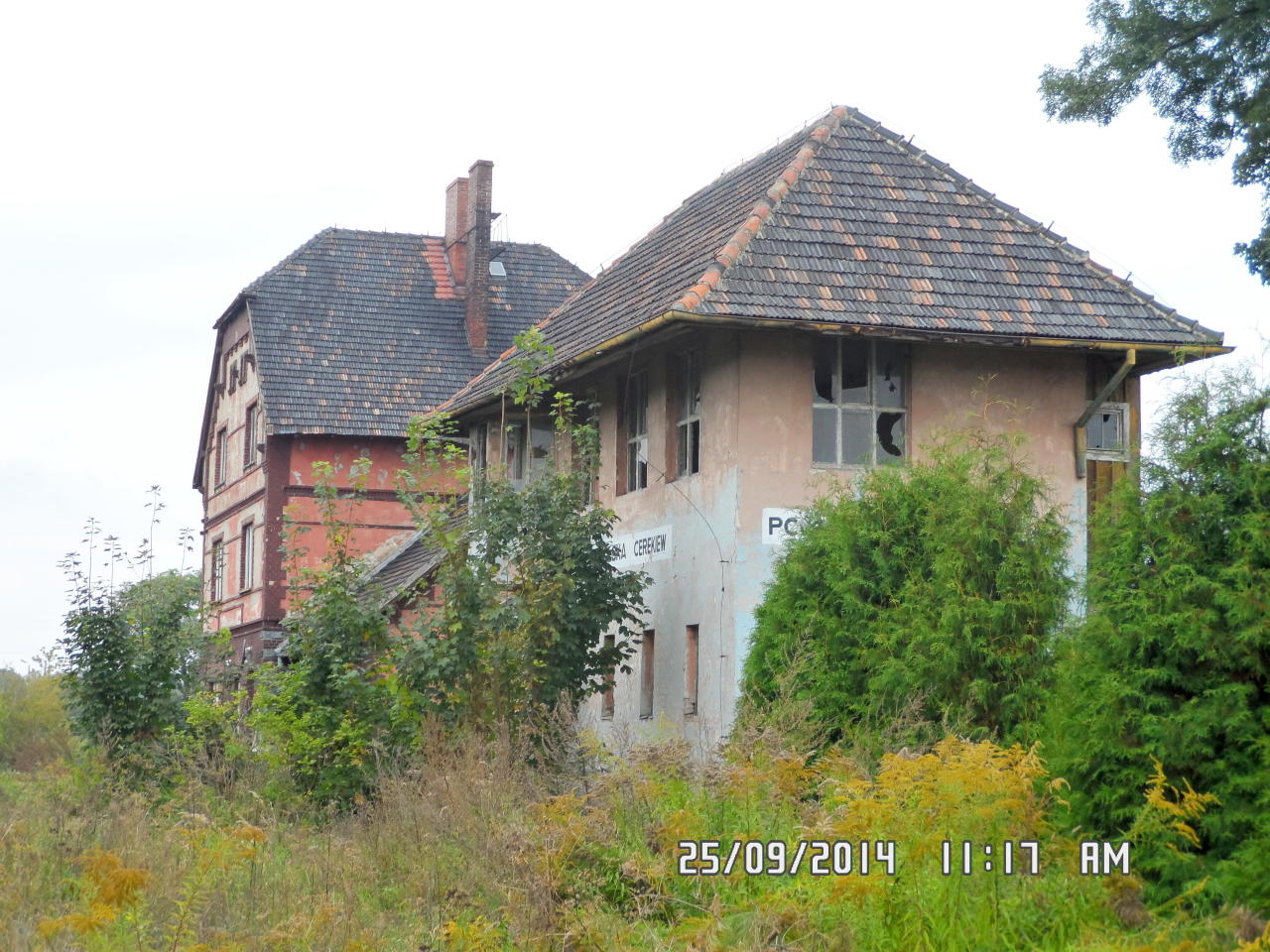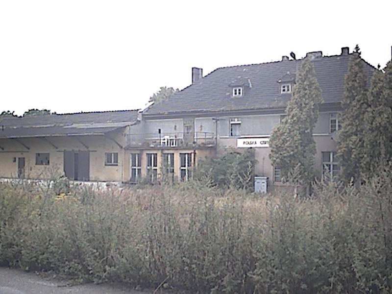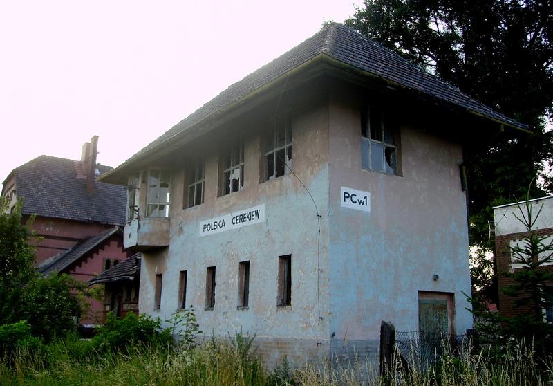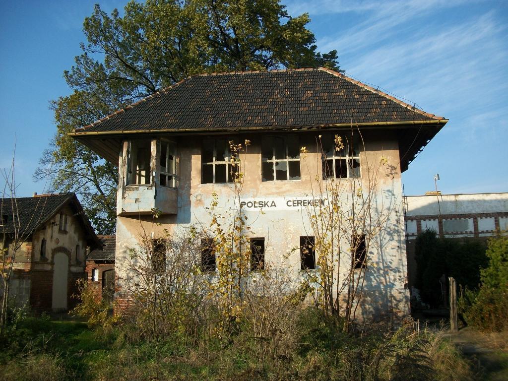 Polska Cerekiew - nastawnia wykonawcza PCw1, stojąca na wylocie na Kędzierzyn-Koźle (w prawo) jeszcze jakoś stoi. W lewo perony.
