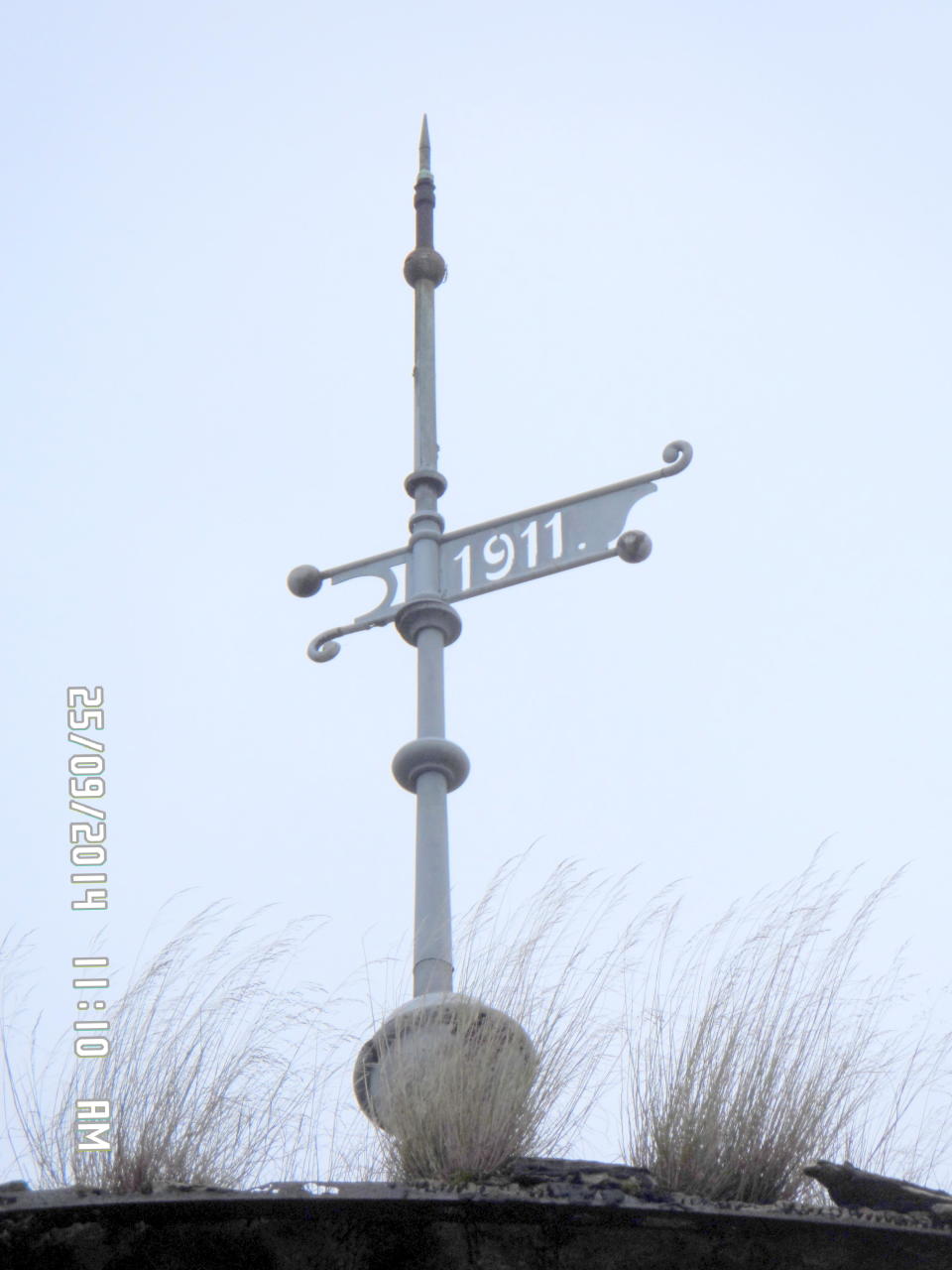 Szpic z chorągiewką na dachu wieży wodnej z rokiem budowy.