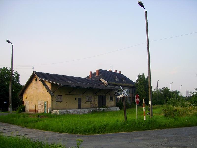 Pierwszy budynek dworca z magazynem towarowym, stojący na końcu ul. Dworcowej. Obiekty stoją na wyjeździe do Kędzierzyna-Koźla. Torowisko znajduje się po prawej stronie.