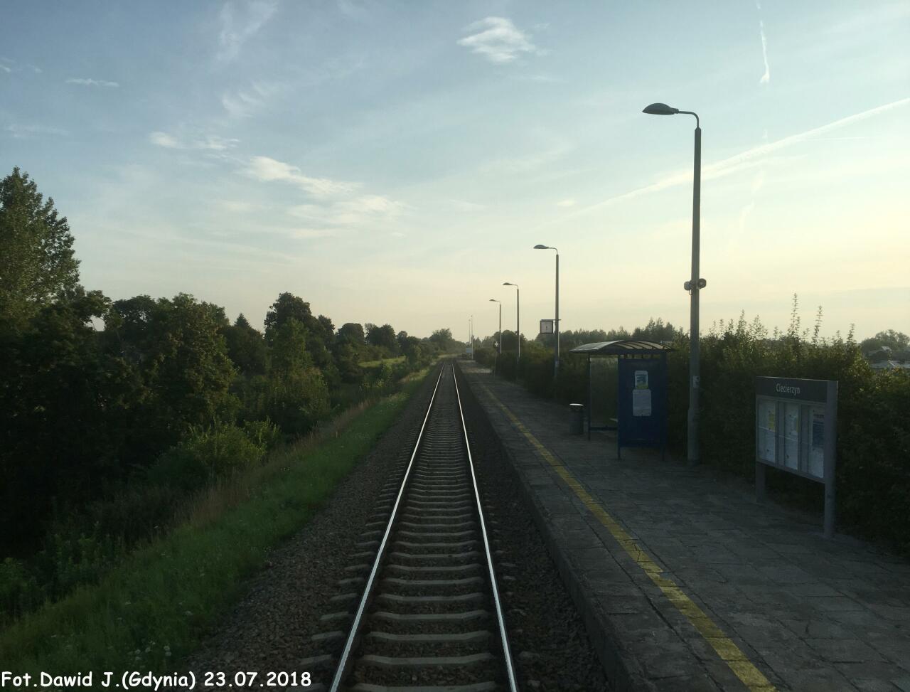 Widok w kierunku Lubartowa, Łukowa. Peron po prawej stronie. Na peronie znajduję się wiata dla podróżnych, tablica z nazwą stacji.