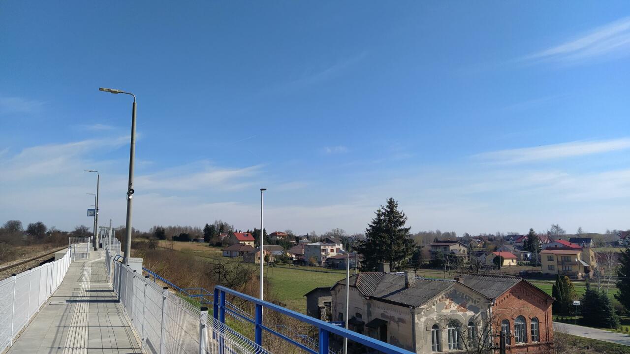 Widok na peron, dawny budynek stacji oraz panoramę wsi.