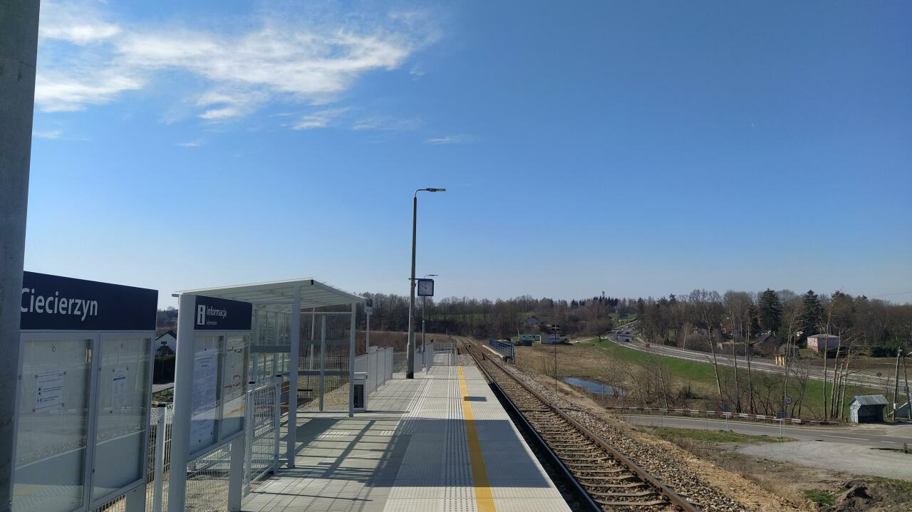 Widoczny słupek kilometrażowy przy peronie przystanku Ciecierzyn.