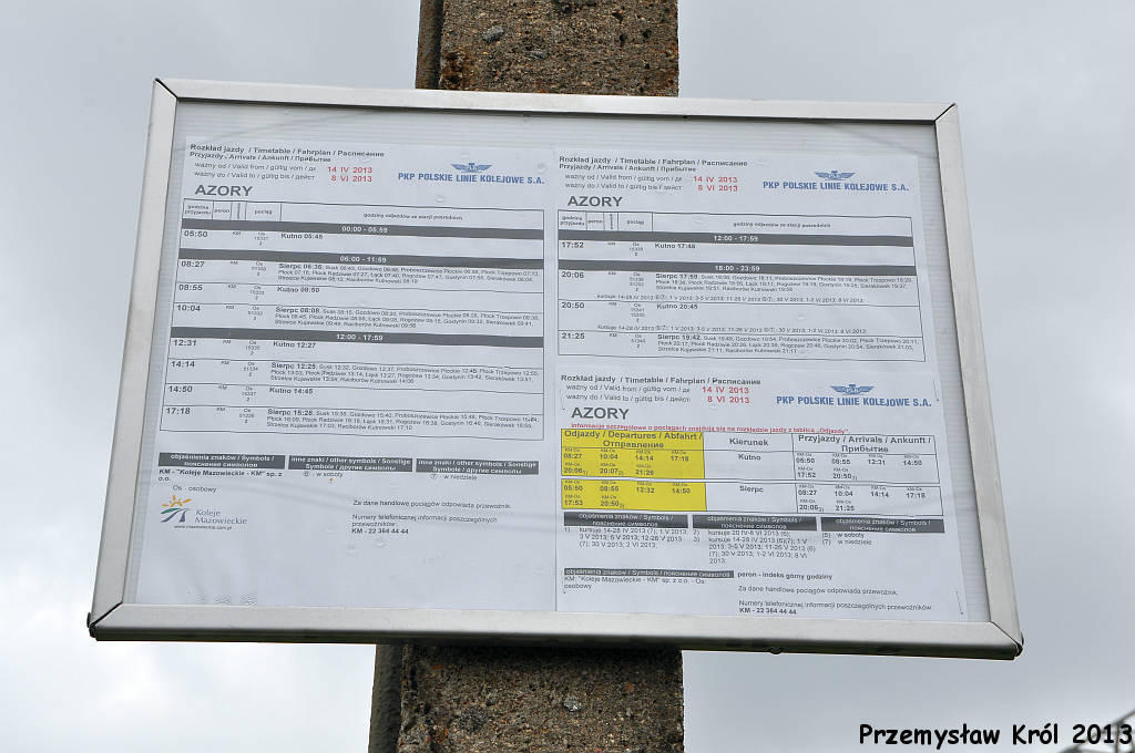 Opis ogólny: Peron przystanku jest wąski, krótki, leży na łuku i nie posiada obecnie żadnych tablic. Jest to typowy przystanek dla kolejarzy (na przeciw lokomotywowni) 27-05-2005 Peron jest tylko dla linii Kutno-Brodnica jednak po zmianie w rozkładzie od 10.12.2006 na stacji nie zatrzymują się rozkładowe pociągi pasażerskie (konkretnie jeden pociąg) "do odwołania" więc może już nigdy się nie będą zatrzymywać… (info: Krzysztof Marciniak, 2007-01-23) Od dn. 15.10.07 na przystanku zatrzymują się znów pociągi pasażerskie. Zamontowano także tablice z napisem KUTNO AZORY. Wg. rozkładu ważnego do 13.12.08 z AZORÓW pociągiem osobowym można dojechać do KUTNA i SIERPCA. (info: ADAM PIOTROWSKI, 2007-12-22). W latach 1931-1943 i 1945-1947 przystanek Azory funkcjonował też na liniach nr 3 (Warszawa Wsch - Kunowice) i 18 (Kutno - Piła Gł.). Postoje zaliczały tam wybrane pary pociągów, bądź przejeżdżały bez zatrzymania. Od 1948 r. przystanek funkcjonuje wyłącznie dla linii nr 33 Kutno - Brodnica. W dokumentach nigdy nie pojawił się pod nazwą Kutno Azory. Tablica peronowa z tą nazwą jest prywatną inicjatywą kolejarzy. |