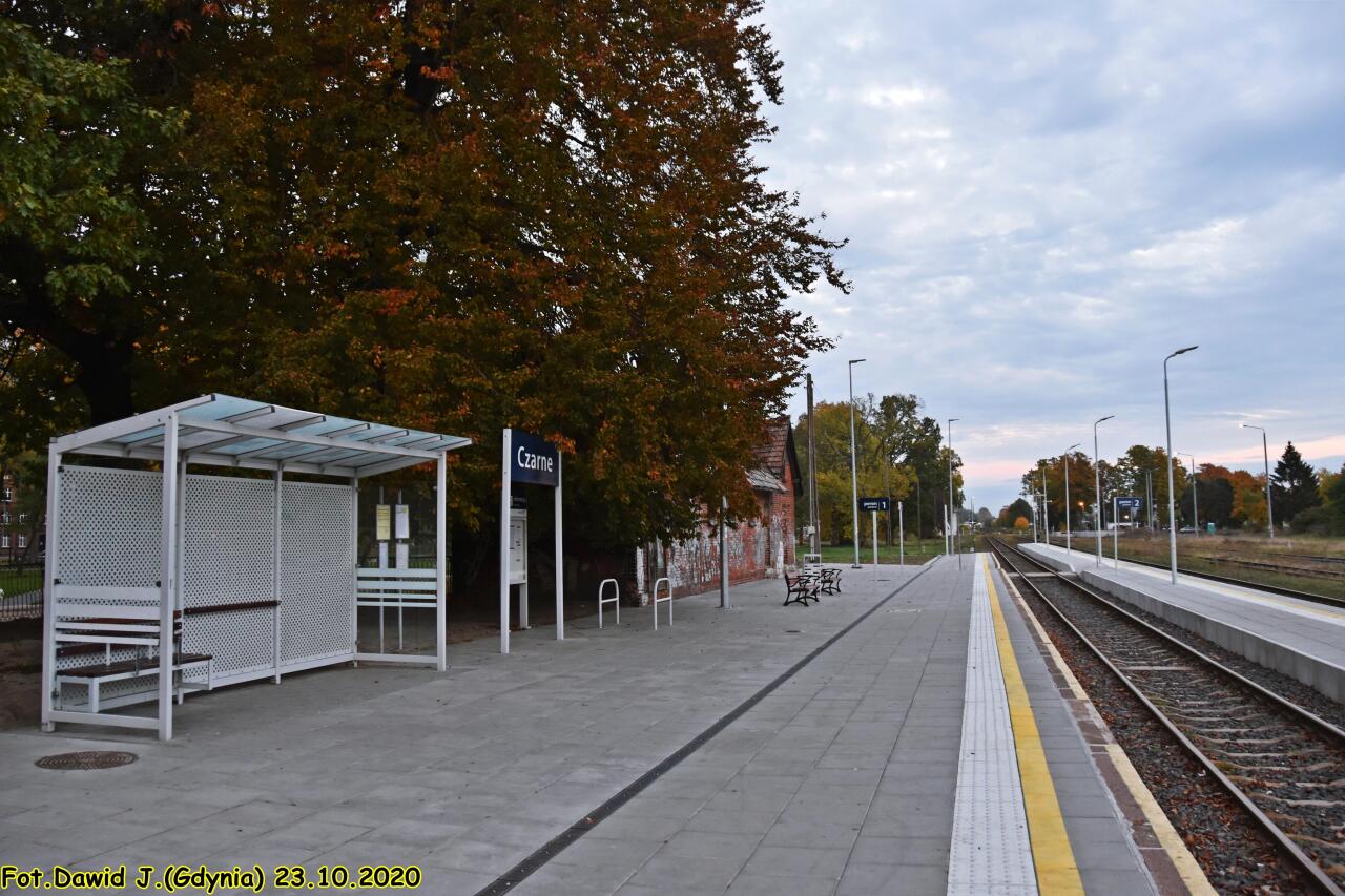 budynki dworcowe: | Dworzec kolejowy w Czarnem w 2014 roku uległ spaleniu. Najpierw magazyn (potem został zburzony), później lewa część dworca (niezamieszkała). Poczekalnia – małe pomieszczenie od strony miasta. | |