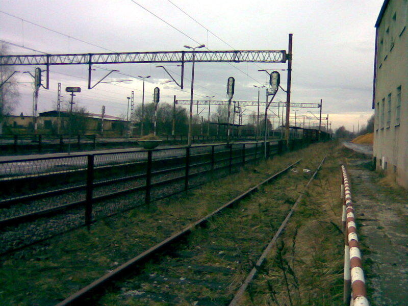 Pawłowice Śląskie, widok z peronu 2 w kierunku Żor i Chybia. W oddali budynek gospodarczy i nastawnia dysponująca "PS".