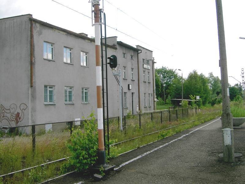 Widok na budynek dworca od strony peronów. Kierunek północny; w lewo Jastrzębie-Zdrój, w prawo Żory i Chybie.