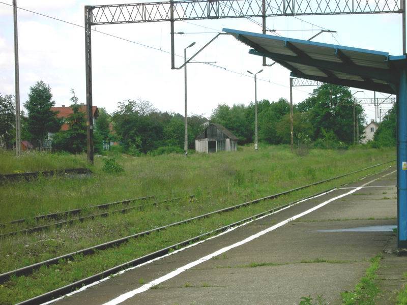 Równia stacyjna, z prawej końcówka peronu. Widok w kierunku Oświęcimia.