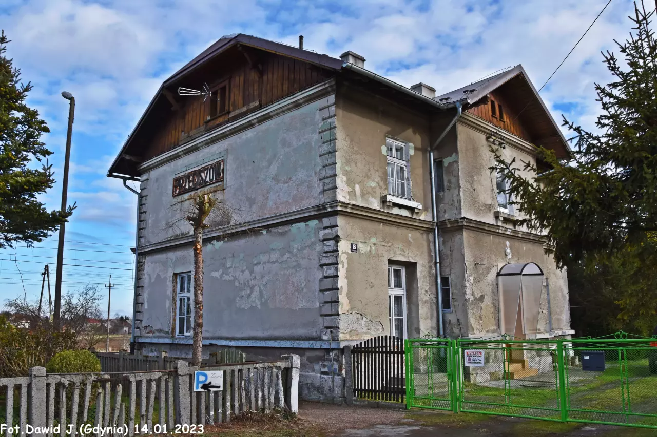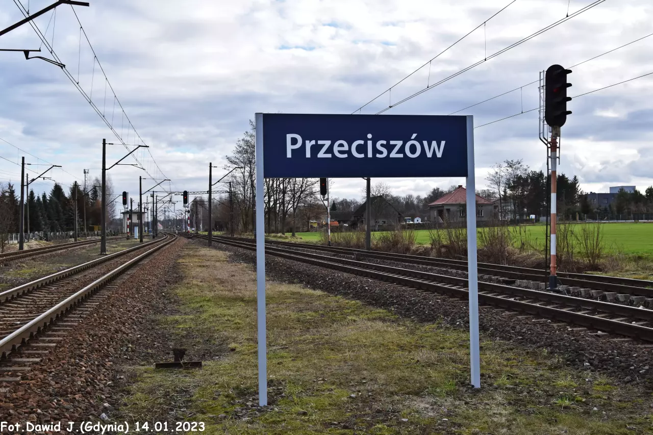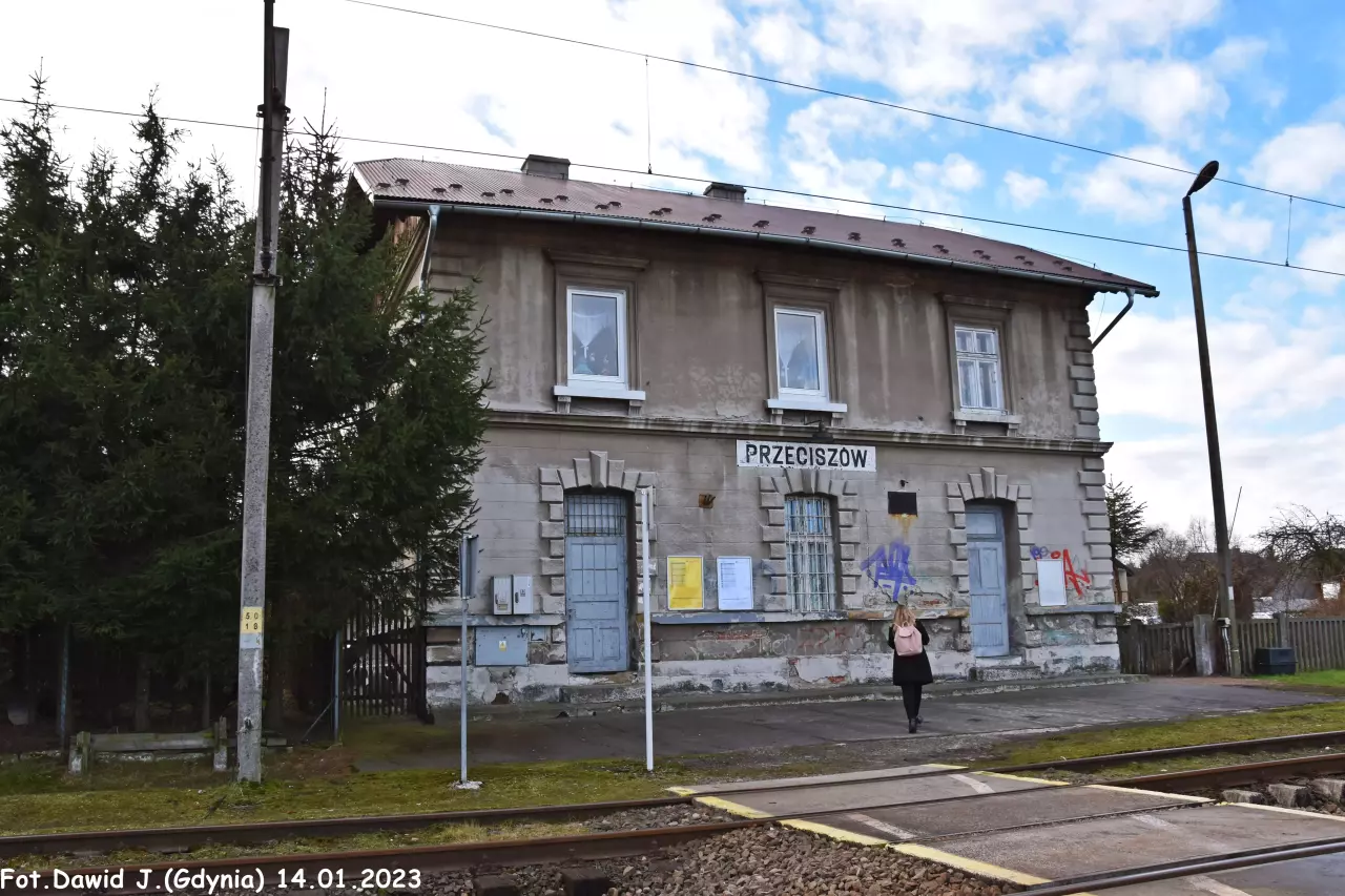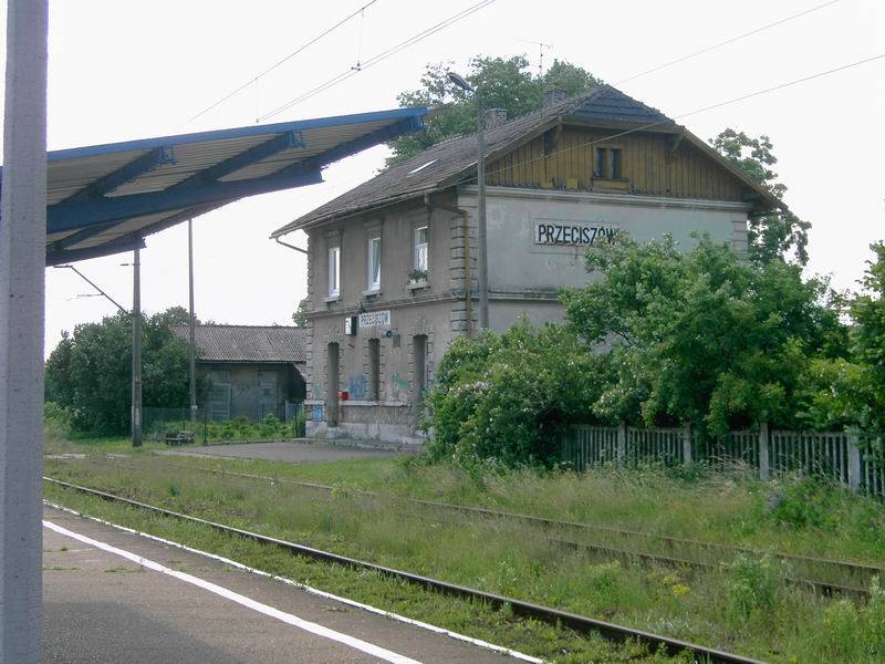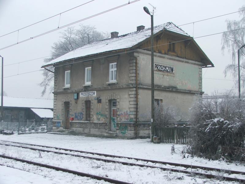 Budynek dworca w Przeciszowie. Widok od strony peronu; w prawo Oświęcim, w lewo Spytkowice/Kraków.