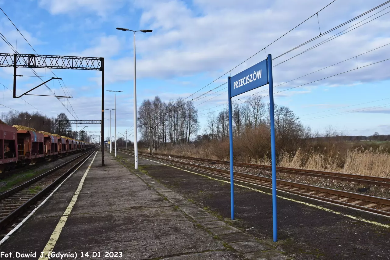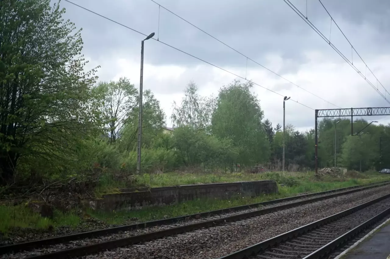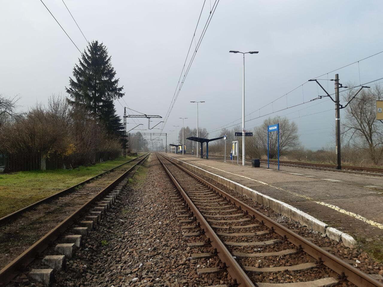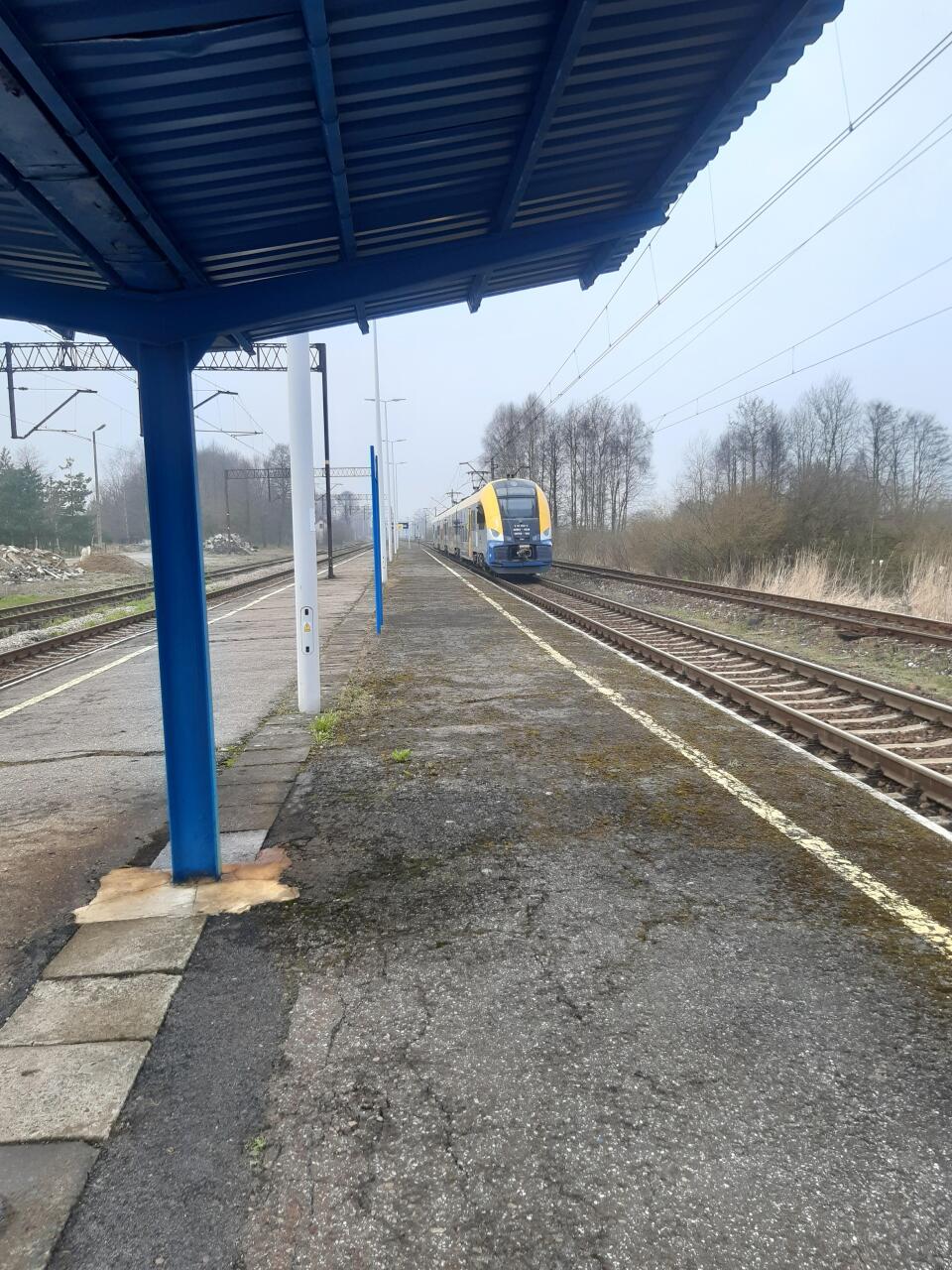 Peron wyspowy w Przeciszowie, z prawej, w oddali odpoczywający pociąg Kolei Małopolskich. Widok w kierunku Oświęcimia.
