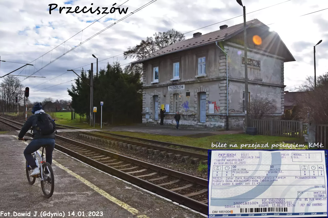 Budynek dworcowy widoczny od strony torów. Widok z peronu w kierunku Spytkowic/Krakowa Głównego. Bilet na przejazd pociągiem KMŁ do Krakowa Głównego (wydrukowany z innej kasy biletowej), z grubsza wygląda na niedrogi, nawet według taryfy normalnej.