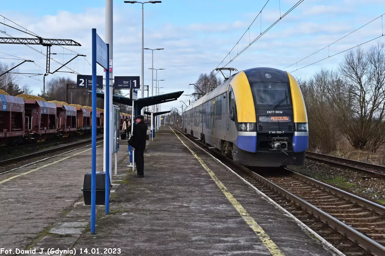 Widok z peronu w kierunku Oświęcimia. Tablica z nazwą stacji. Nowoczesny pociąg EN77-003 oczekuje przy peronie.