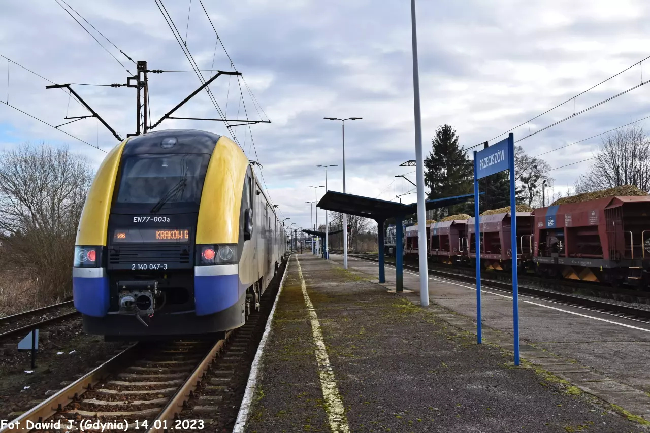 Widok z peronu w kierunku Spytkowic/Krakowa Głównego. Tablica z nazwą stacji. Nowoczesny pociąg EN77-003 oczekuje przy peronie, przed realizacją kursu KMŁ do Krakowa Głównego.