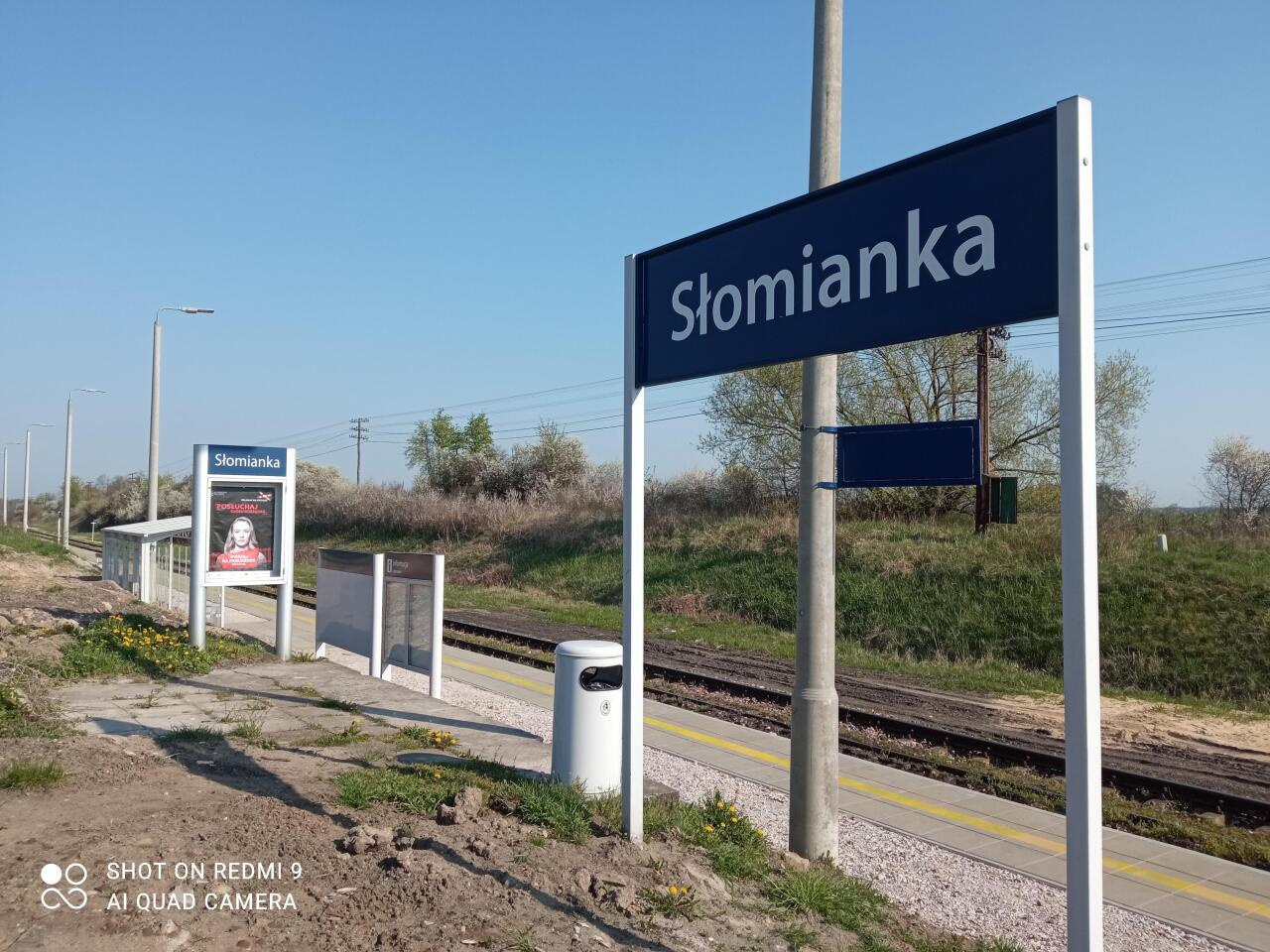 W Słomiance była stacja kolejowa, podobna do tej istniejącej w Szadkowicach. Stacja kolejowa usytuowana była powyżej widocznej dzisiaj wiaty. Na stacji funkcjonowała kasa biletowa, duża poczekalnia oraz pomieszczenia służbowe dla kolejarzy. Stacja posiadała także piwnice w który składowany był węgiel, drzewo , jak także wyposażenie techniczne dla brygady napraw kolejowych. Stacja z racji swego usytuowania była widoczna z daleka. Stacja została rozebrana w roku 1987-88. Do stacji przynależały dwie budki kolejowe , na tak zwanej mijance, nadmienić tutaj należy , że stacja z uwagi , iż posiadała dwa tory gwarantowała mijanie się pociągów. Pierwsza budka była usytuowana w kierunku Tomaszowa w miejscowości Antoniówka , natomiast druga w kierunku Opoczna za Gawronami.