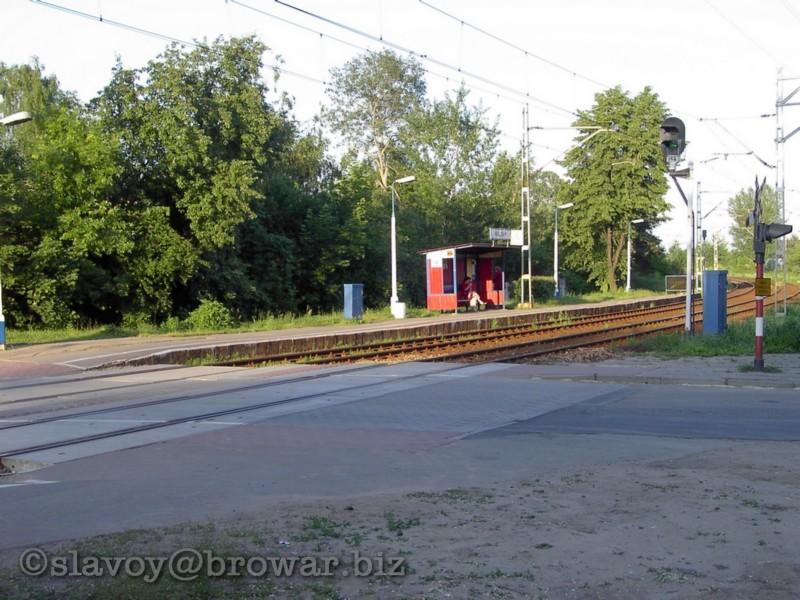 Opis infrastruktury: Perony ułożone w formie ochronnej przejazdu, znajdującego się między nimi - pociąg zawsze zatrzymuje się przed przejazdem. Układ stosowany na sporej ilości przystanków WKD. |