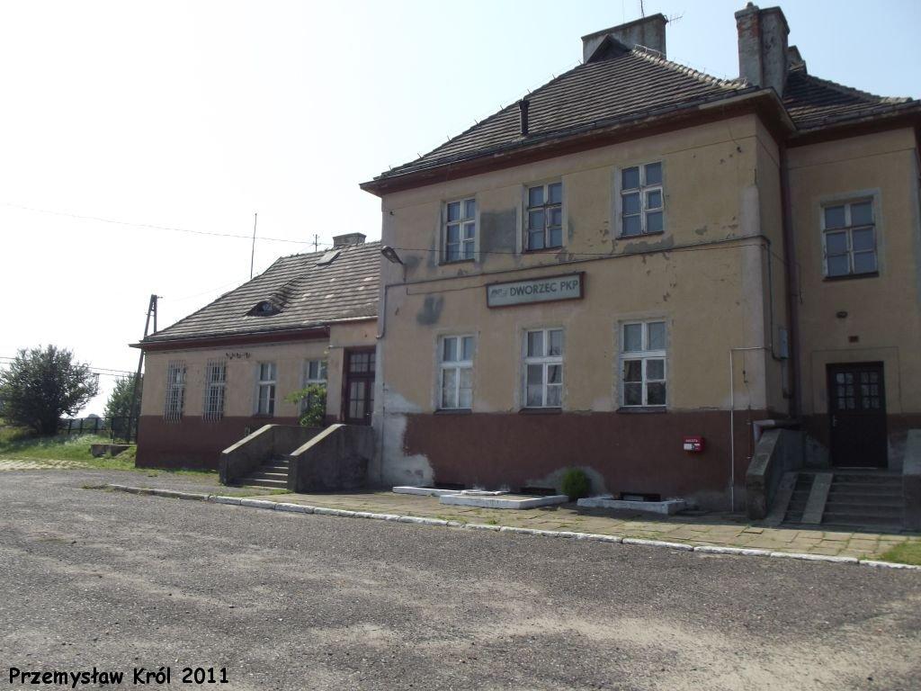 Budynek dworca od strony peronów. Na parterze (z prawej, poza kadrem) mieści się nastawnia dysponująca. Widok od strony Chorzewa Siemkowic.