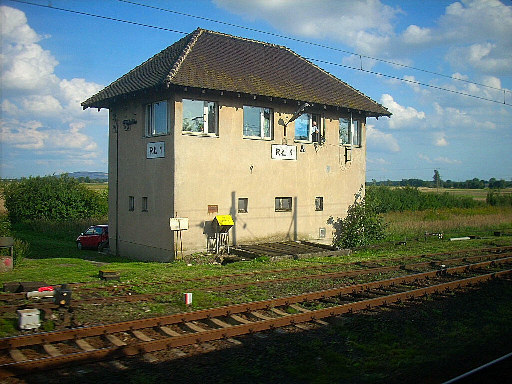 Nastawnia wykonawcza RŁ1 na stacji Rusiec Łódzki. W lewo dworzec, w prawo Chorzew Siemkowice. Widok z okna pociągu InterRegio "Bursztyn", relacji Gdynia Główna - Katowice.