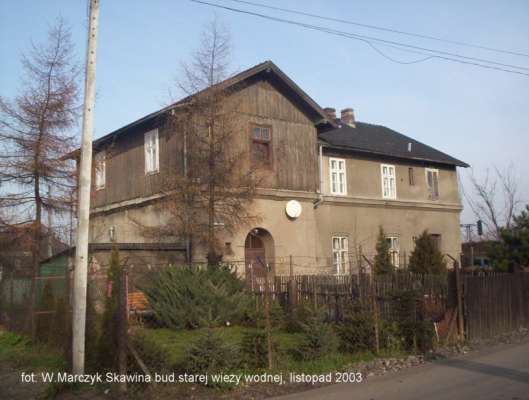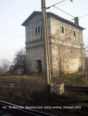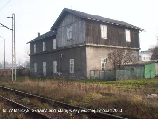 Budynek dawnej wieży wodnej przy ulicy Kolejowej, przy wyjeździe na Kraków (w lewo). Widok od strony torów w kierunku południowo-wschodnim.