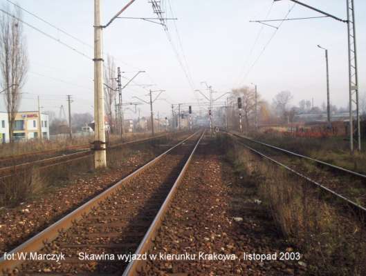 Głowica wschodnia, od strony wjazdu z Krakowa (za plecami). Widok w kierunku zachodnim. Widoczne wszystkie sześć semaforów wyjazdowych w stronę Krakowa Płaszowa (jeden dwukomorowy).