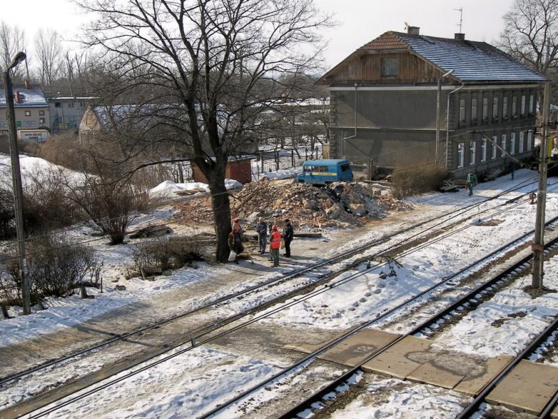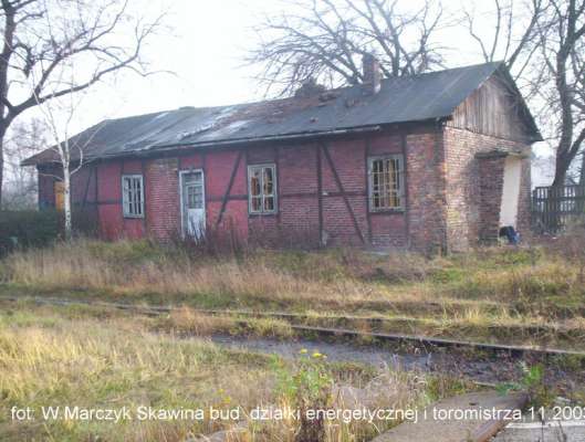 PKP Skawina. Widok z kładki nad torami na gruzowisko po zlikwidowanym schronisku dla manewrowych. Za nim kolejowy budynek mieszkalny. Kierunek południowo-zachodni; wyjazdy na Spytkowice/Oświęcim, Kalwarię Zebrzydowską.