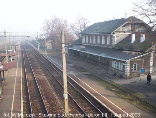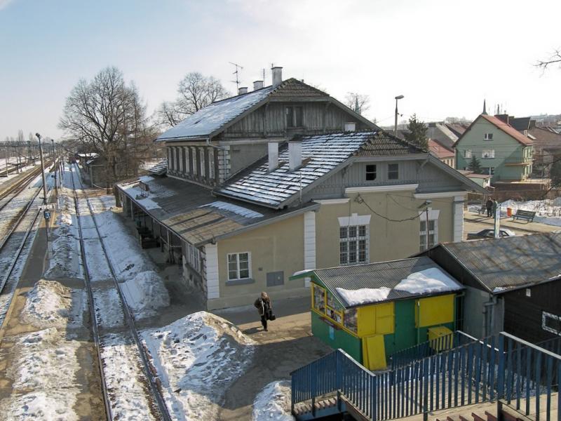 PKP Skawina. Widok z kładki na budynek stacyjny w kierunku wschodnim (Kraków).