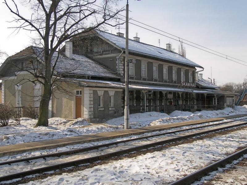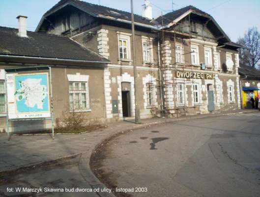 PKP Skawina. Budynek odremontowany w ramach otwarcia Kolejowego Szlaku Jana Pawła II. Widok od strony ulicy, w kierunku północno-zachodnim.