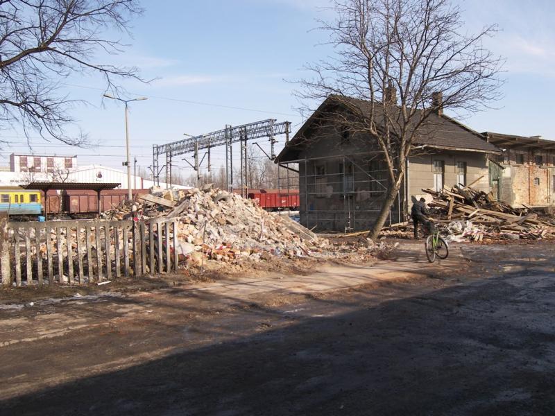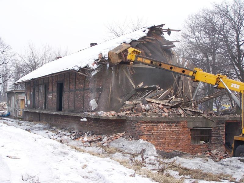 PKP Skawina. Fizyczna likwidacja budynku, w którym znajdował się w latach 70 tych Odcinek Zabezpieczenia Ruchu Kolejowego i magazyny Odcinka Drogowego (kto jeszcze pamięta takie nazwy?). Widok od strony podjazdu w kierunku północno-zachodnim.
