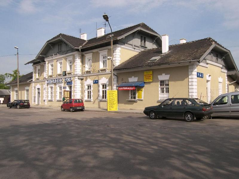 Budynek dawnej wieży wodnej przy ulicy Kolejowej, przy wyjeździe na Kraków (w prawo). Widok w kierunku północnym, od strony ulicy; w lewo dworzec.