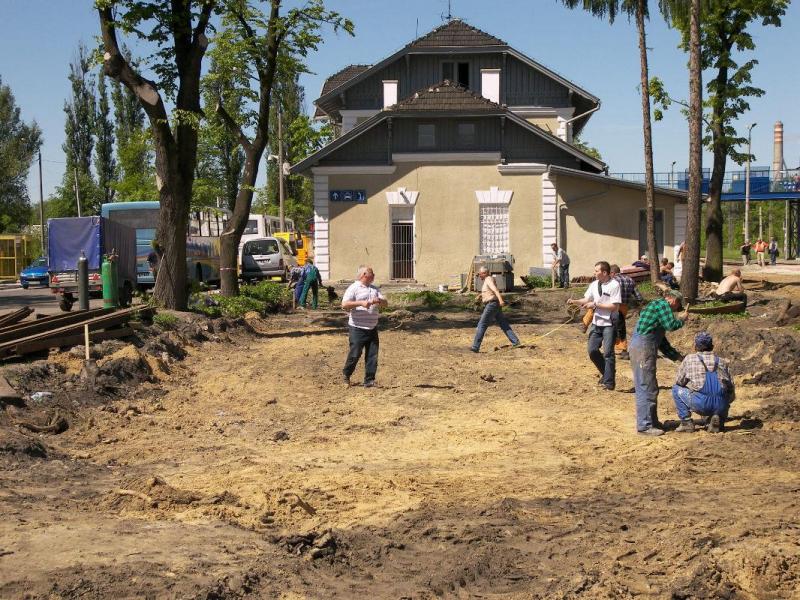 PKP Skawina. Budowa parkingu w ramach otwarcia Kolejowego Szlaku Jana Pawła II. Do niedawna w tym miejscu stał zdewastowany budynek magazynowy.