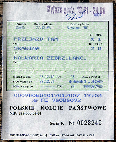 Bilet wydany w zlikwidowanej kasie na stacji Skawina.