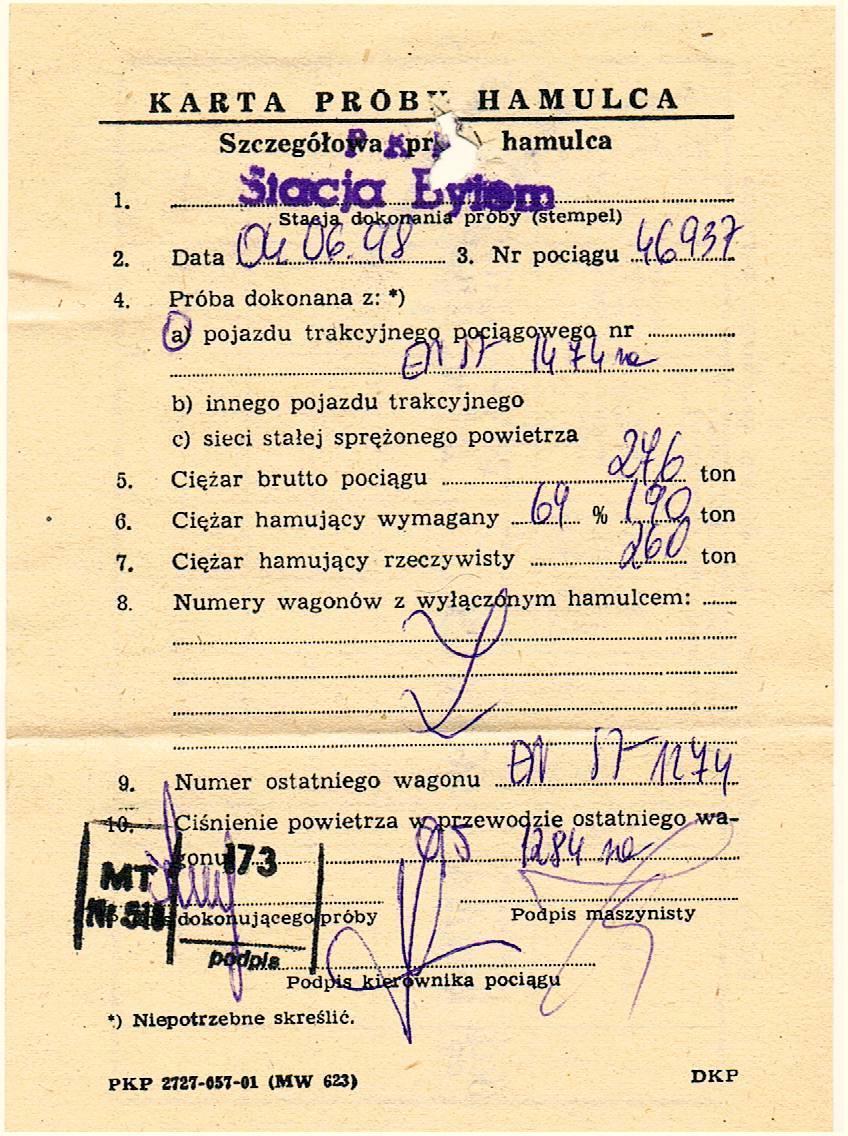 Karta próby hamulca.