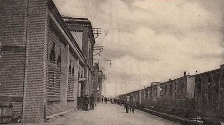 Stara pocztówka. Fragment budynku dworca w perspektywie ulicy.