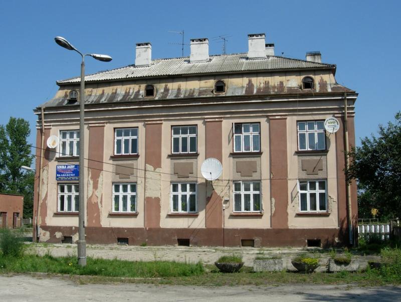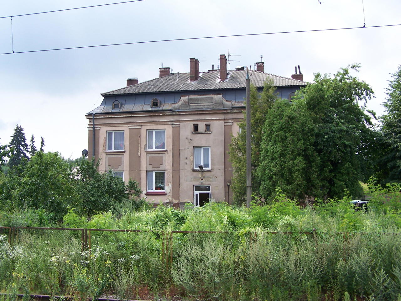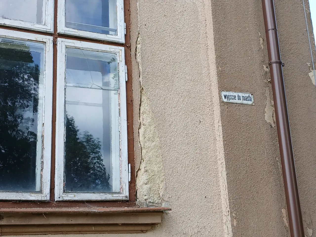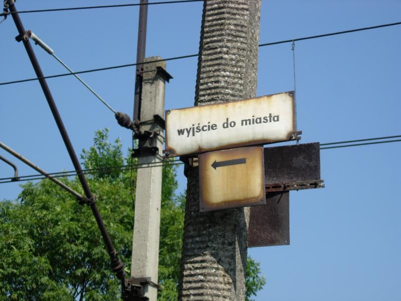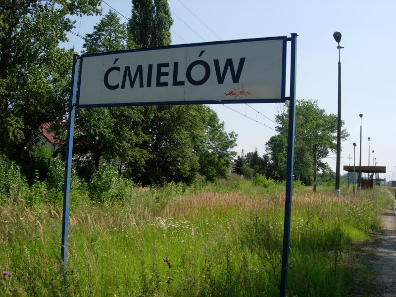 "Wyjście do miasta" na zdezelowanym i nieczynnym budynku dworca. Do centrum Ćmielowa ok. 2 km.