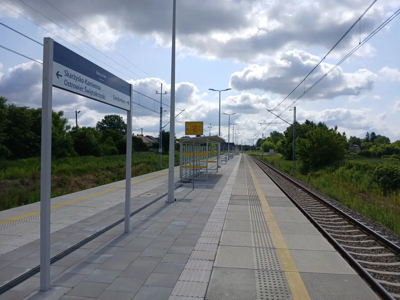 Widok w stronę Ostrowca Świętokrzyskiego. Ukończony peron z wejściem naziemnym. Widać jak bardzo zmieniła się ta stacja po modernizacji.