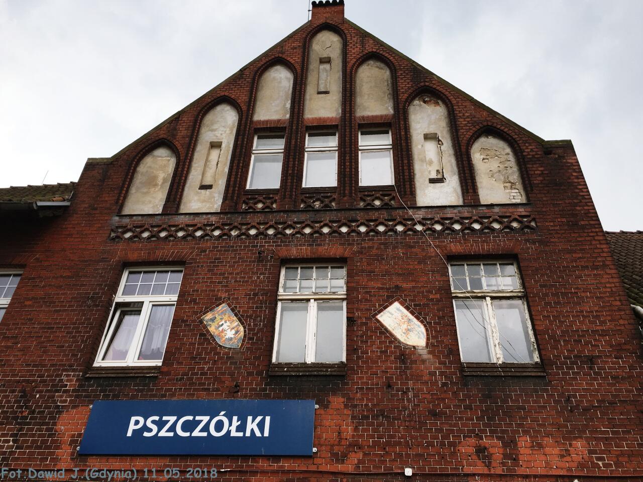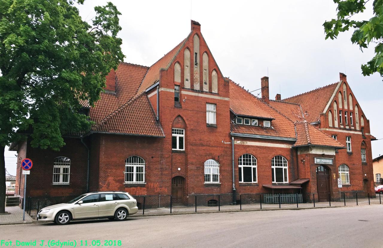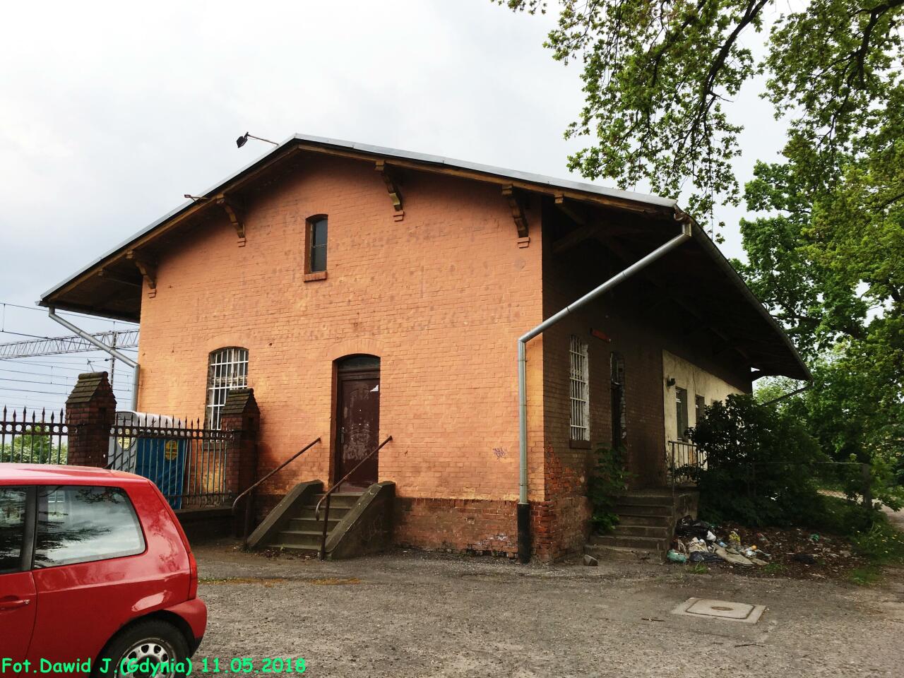 Budynek dworcowy widoczny od strony torów. Widok w kierunku Pruszcza Gdańskiego/Gdańska Głównego i (kiedyś) Skarszew/Kościerzyny.