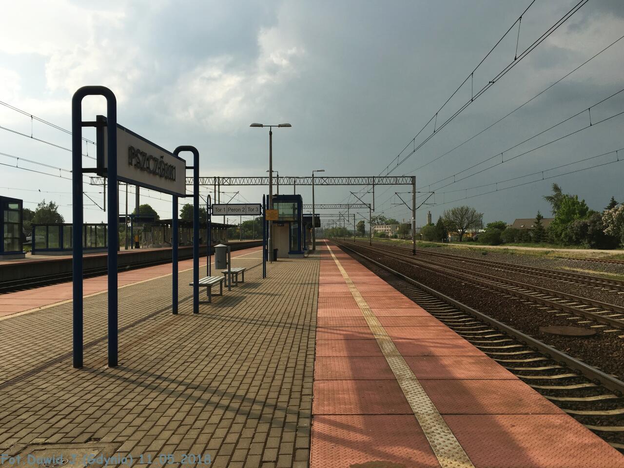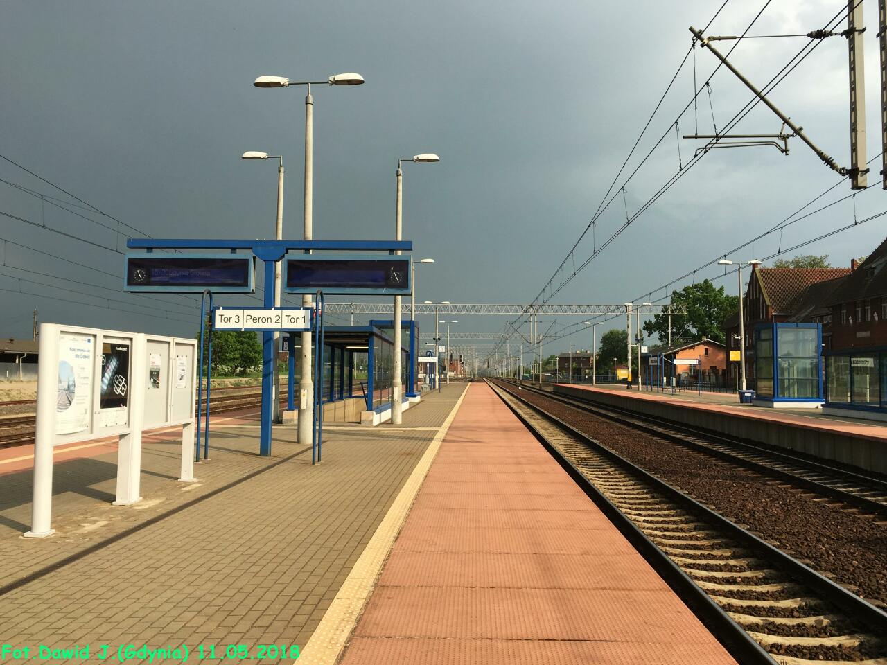 Widok z peronu 2 w kierunku Pruszcza Gdańskiego/Gdańska Głównego i (kiedyś) Skarszew/Kościerzyny. Tablica z nazwą stacji.