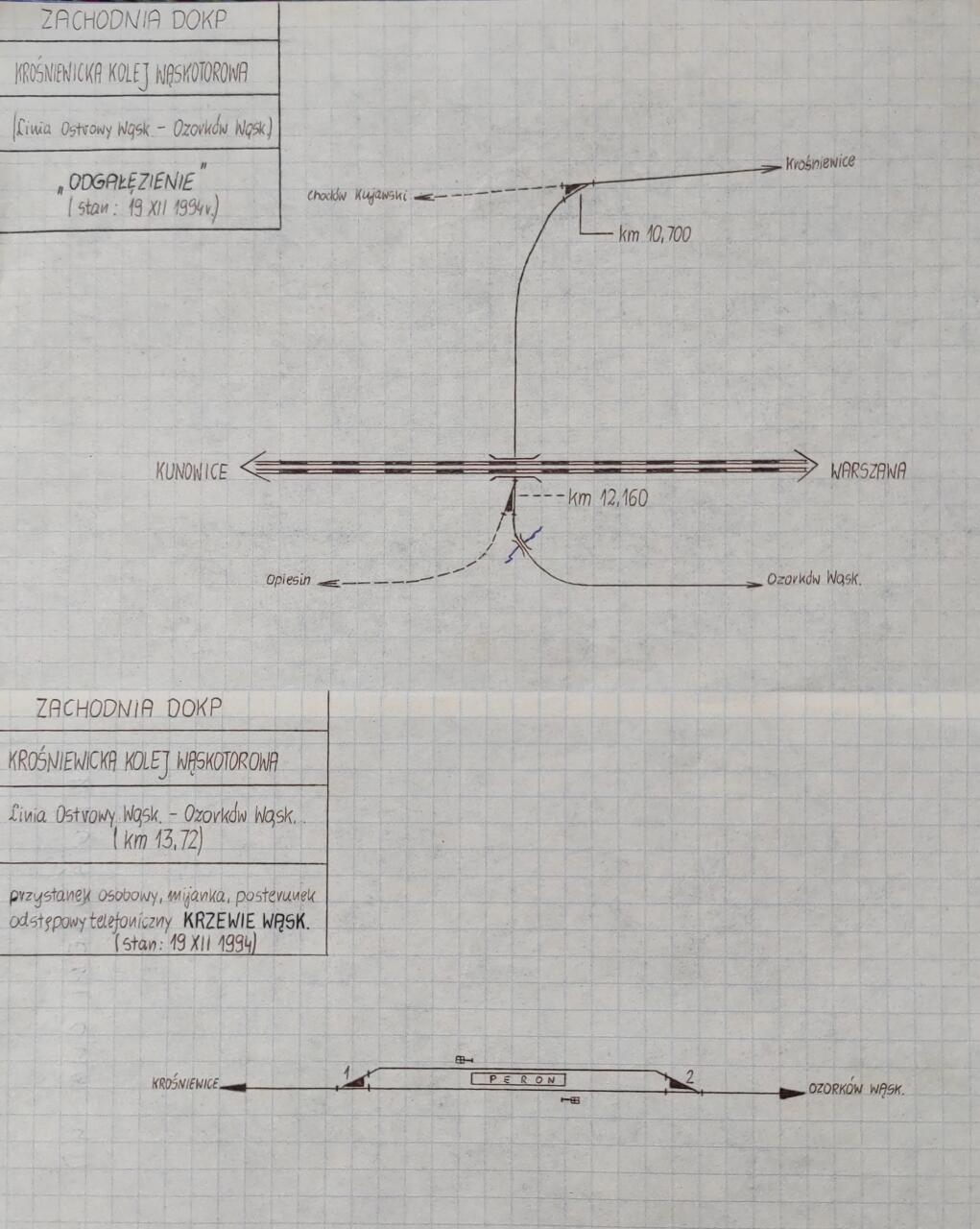 Opis ogólny: Dojście od strony stacji normalnotorowej Krzewie przez przejście podziemne. (info: Michał Kręzel, 01-01-2010) Opis infrastruktury: Ślady w terenie wskazują na istnienie na tym przystanku mijanki - mocno zarośnięte szyny po lewej stronie peronu patrząc w kierunku Łęczycy. Podejrzewam, że kasa wąskotorowa mieściła się w budynku stacji normalnotorowej. (info: Michał Kręzel, 01-01-2010). Docelowe miejsce pierwszych prac remontowych na Krośniewickiej Kolei Dojazdowej. |