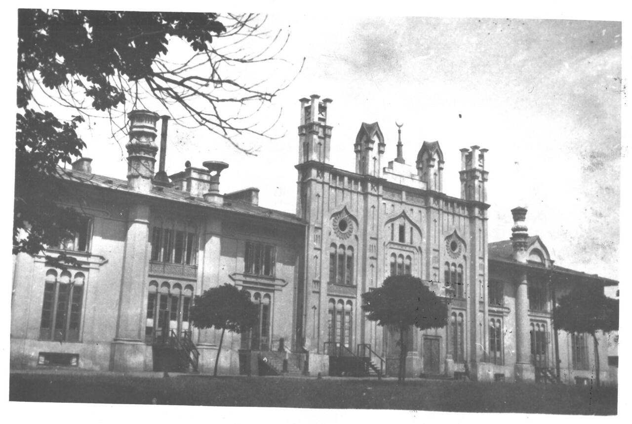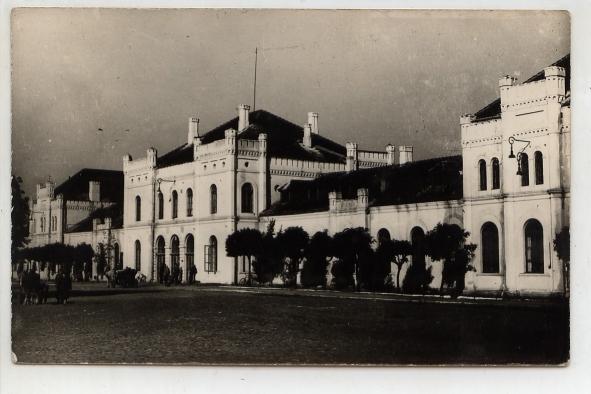 Zdjęcie pierwszego dworca od podjazdu - widoczny "styl mauretański" i nawet półksiężyc. Ze zbiorów AP w Warszawie.