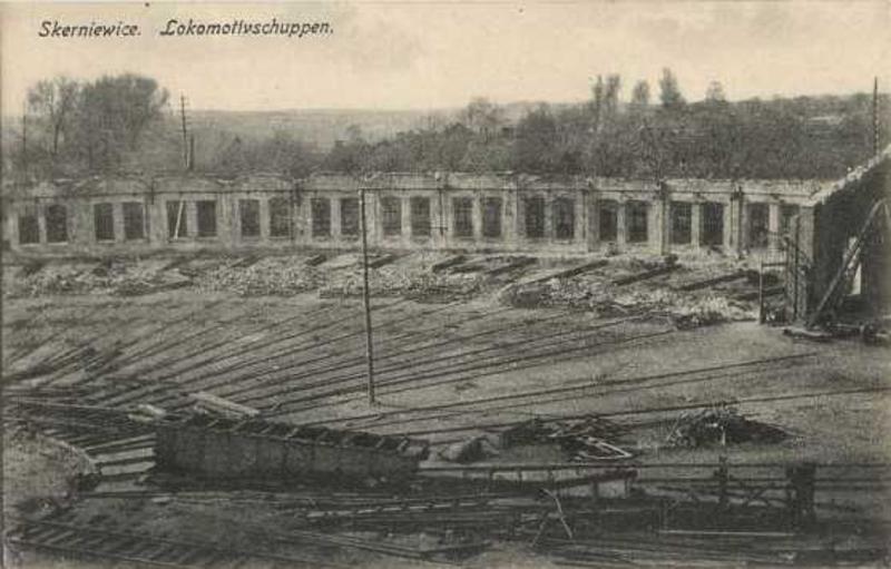 Stara pocztówka. Zniszczona parowozownia-I wojna światowa.