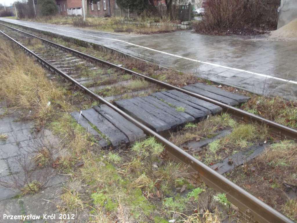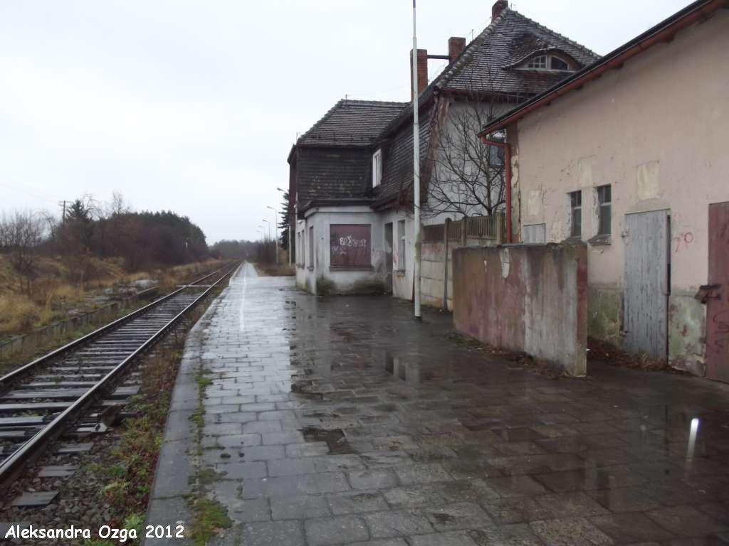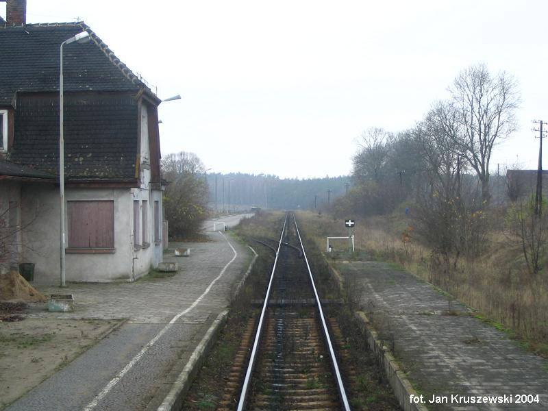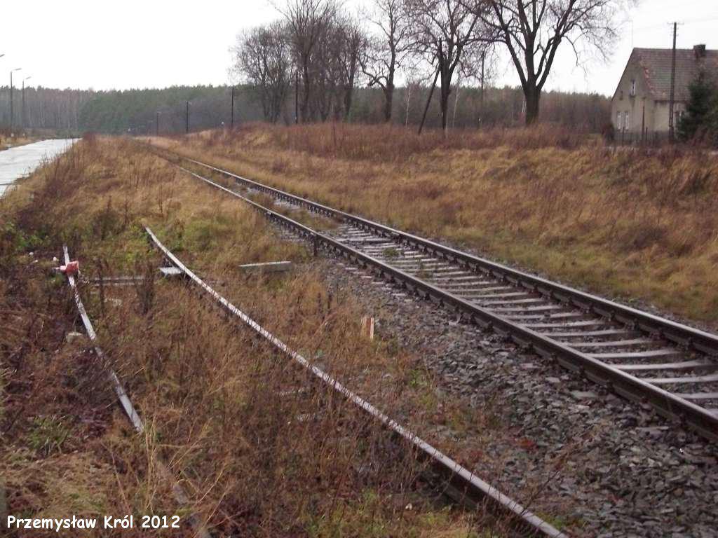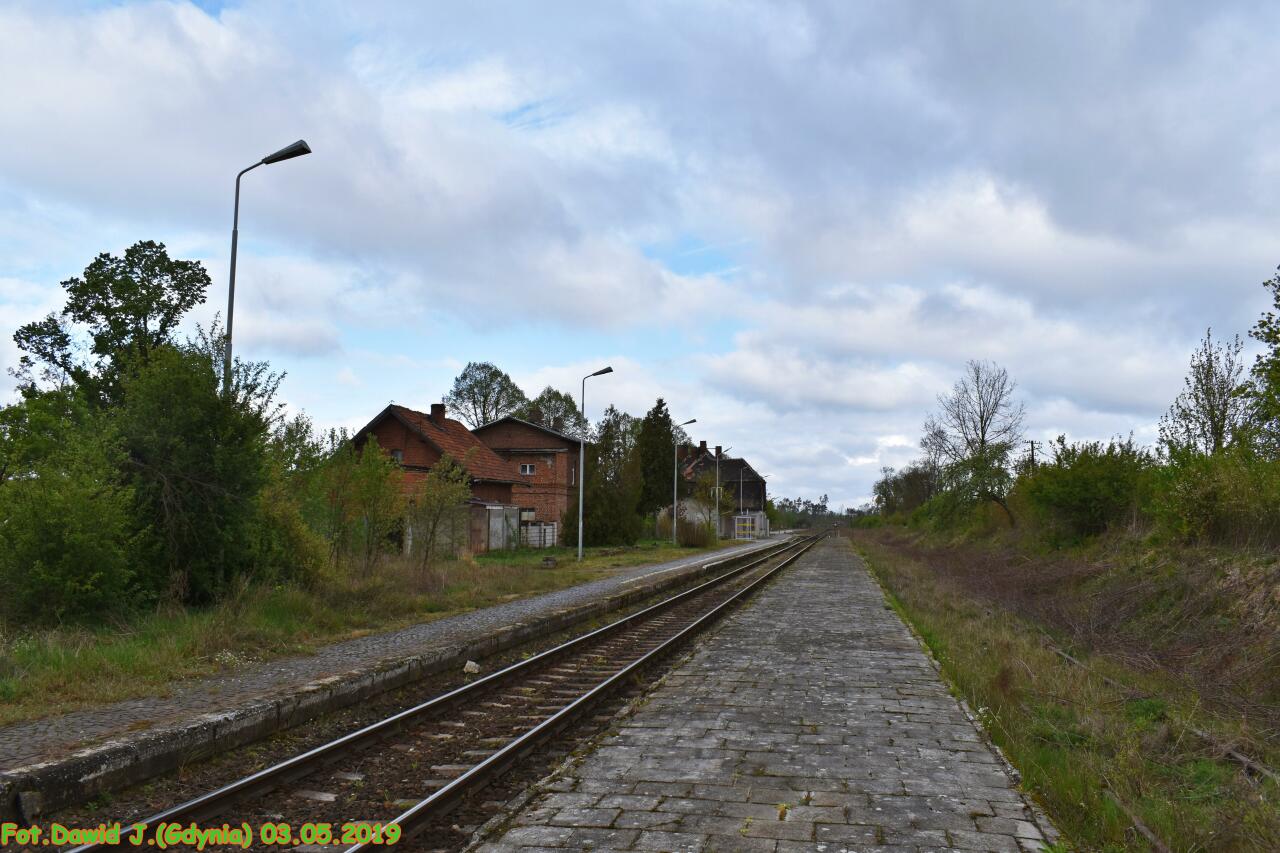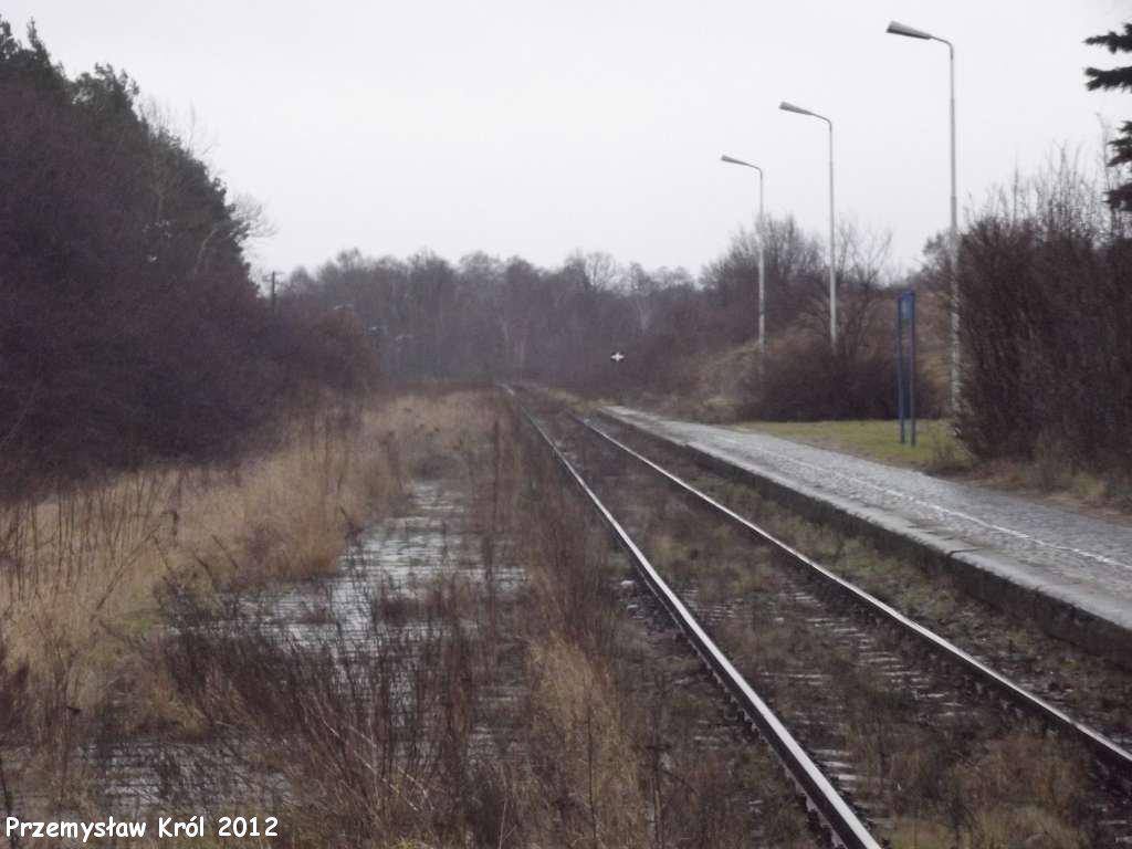 Widok z nieczynnego peronu w kierunku Chojnic. Kolejowe budynki mieszkalne (ul. Kolejowa 8 i 6) znajdują się po lewej stronie.