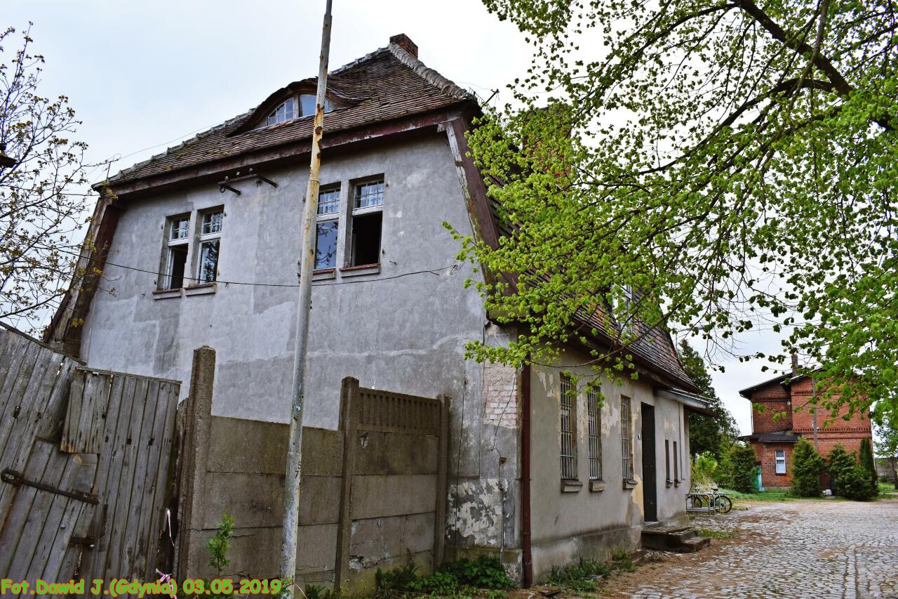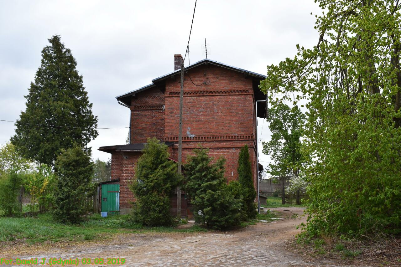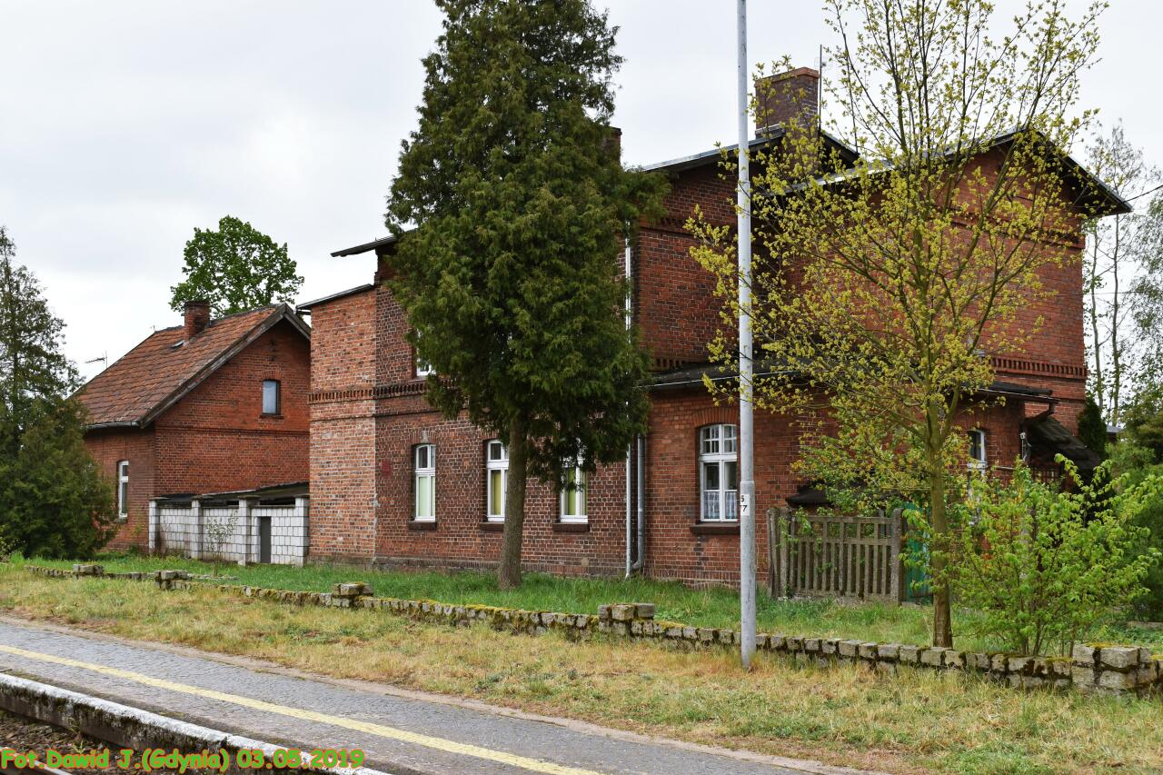 Budynek dworcowy i budynek WC. Obiekty widoczne od strony torów. Widok na perony oraz w kierunku Tucholi/Działdowa.