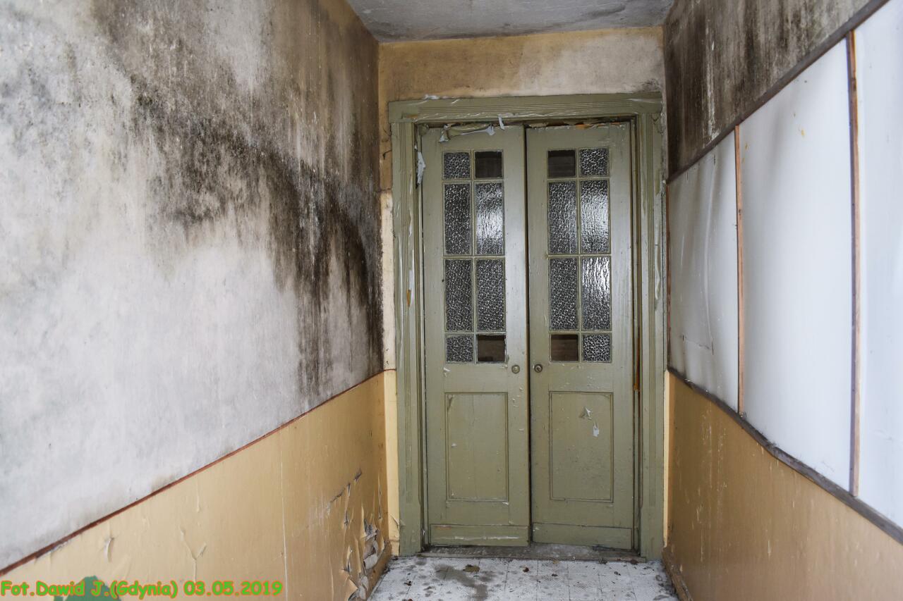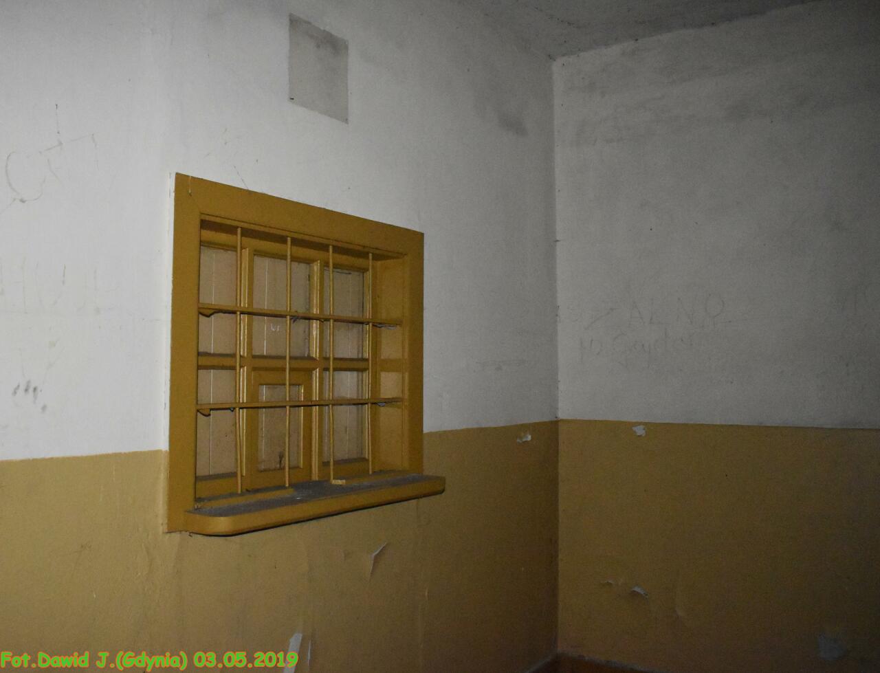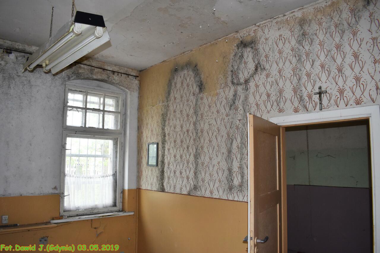 Wnętrze budynku dworcowego. Po lewej stronie znajduję się wejście do nieczynnej poczekalni dla podróżnych, w której jest nieczynne okienko kasy biletowej i nieczynne wyjście na perony. Na ścianie najprawdopodobniej znajduje się data ostatniego malowania: czerwiec 1995 roku.