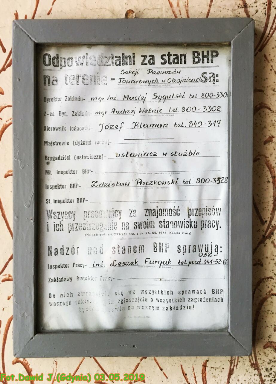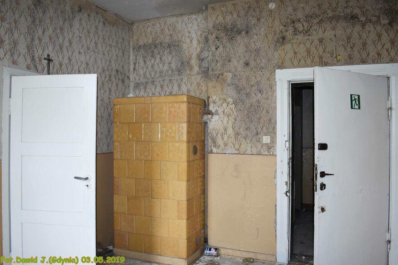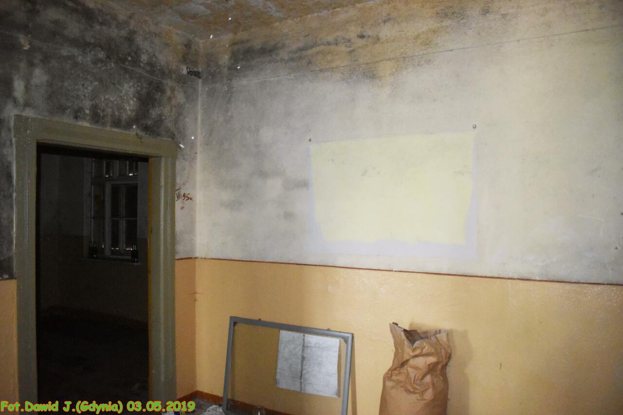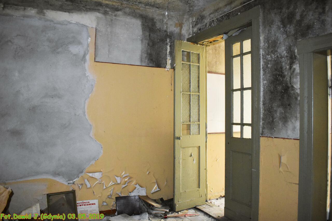 Wnętrze budynku dworcowego. Po lewej stronie znajduję się wejście do nieczynnej poczekalni dla podróżnych, w której jest nieczynne okienko kasy biletowej i nieczynne wyjście na perony. Na ścianie najprawdopodobniej znajduje się data ostatniego malowania: czerwiec 1995 roku.