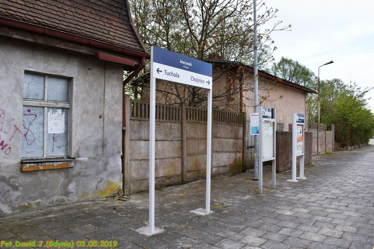 Wiata dla podróżnych i tablica z nazwą przystanku osobowego. W lewo Tuchola/Działdowo, w prawo Chojnice.