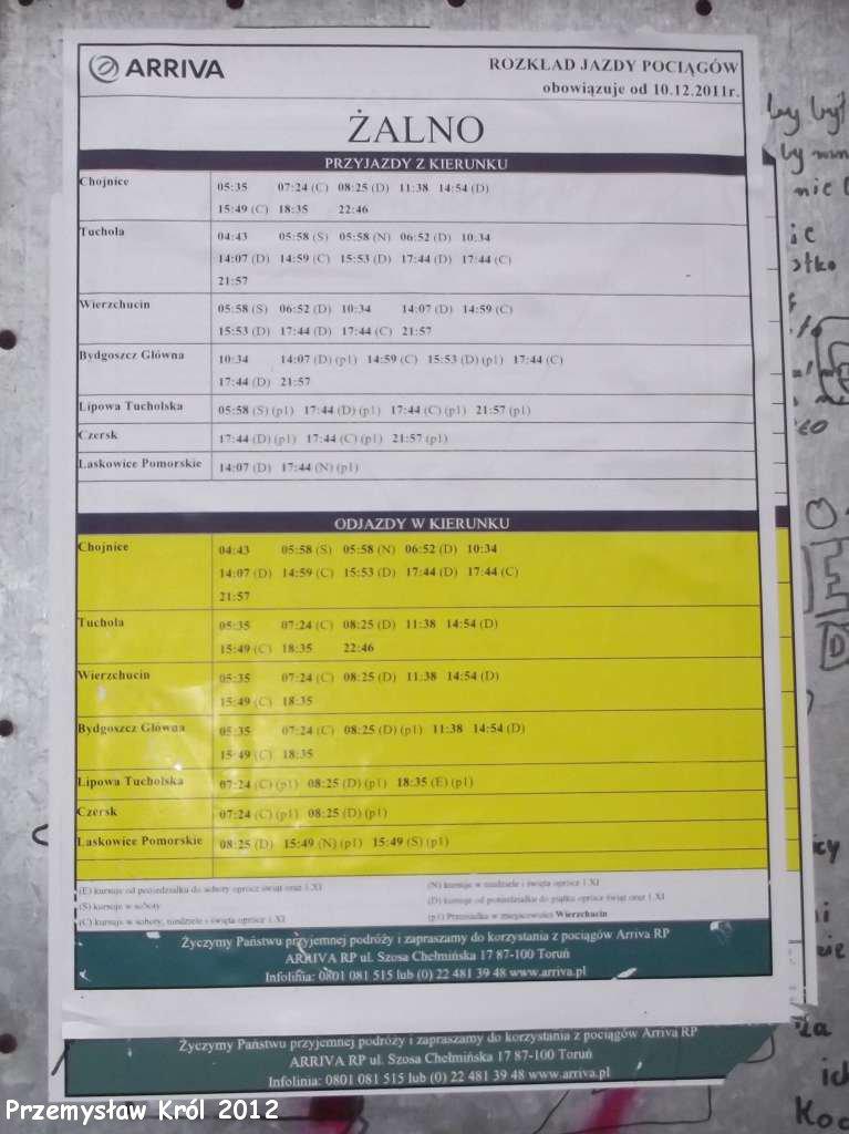 Rozkład jazdy pociągów na przystanku w Żalnie prywatnego przewoźnika Arriva.
