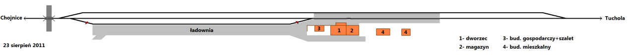Budynek dworcowy z przyległym budynkiem magazynu, widoczny od strony podjazdu. W lewo Chojnice, w prawo Tuchola/Działdowo.