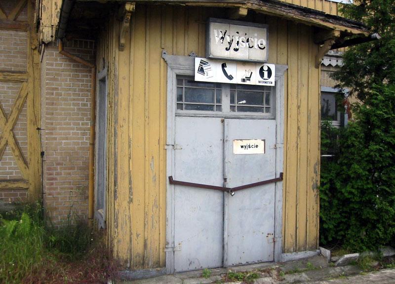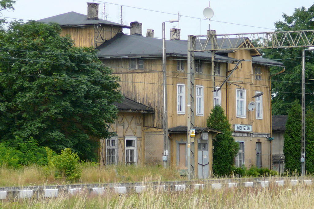 Stacja PKP Wieruszów. Od 1 czerwca 2007 roku powróciły na tę stację pociągi. Na drzwiach budynku dworcowego dostępny jest rozkład jazdy.