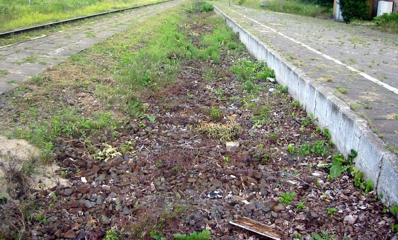 Stacja PKP Wieruszów. Krawędź peronowa przy budynku dworcowym. Ale tory zostały już rozebrane…