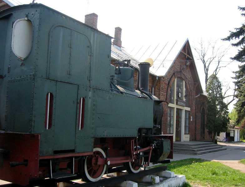 PKP Sochaczew. Budynek dworcowy i zabytkowy parowóz "Ryś" od ulicy Sienkiewicza.